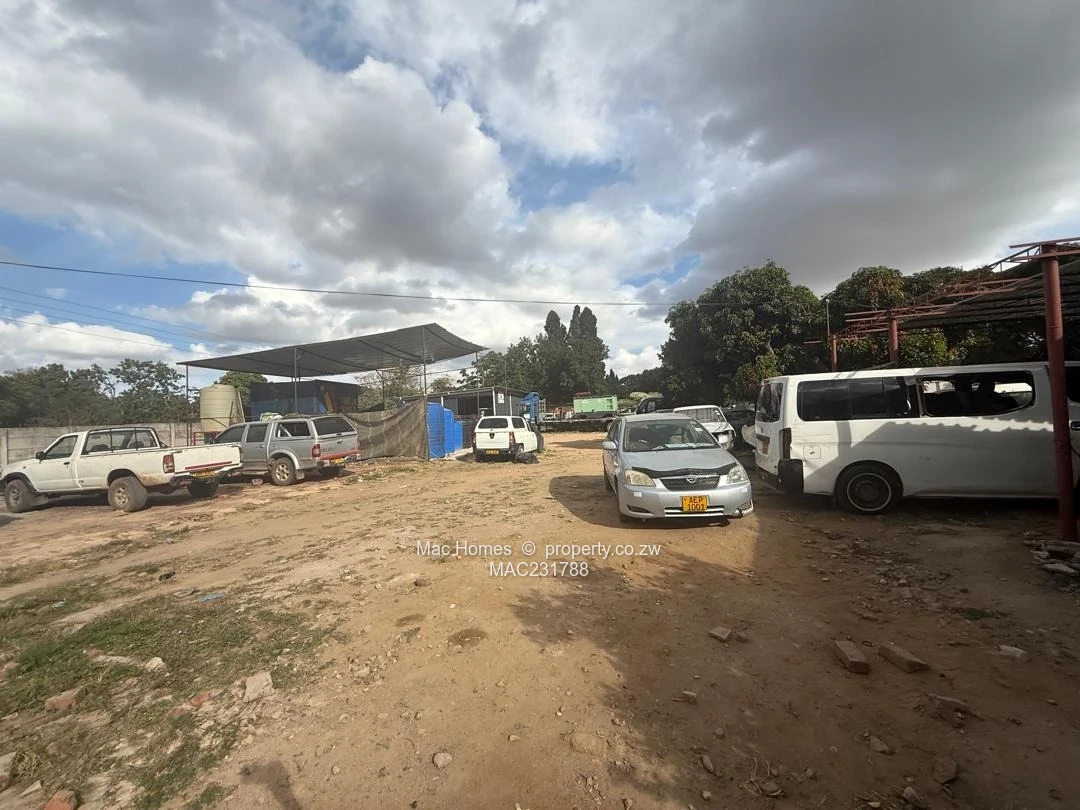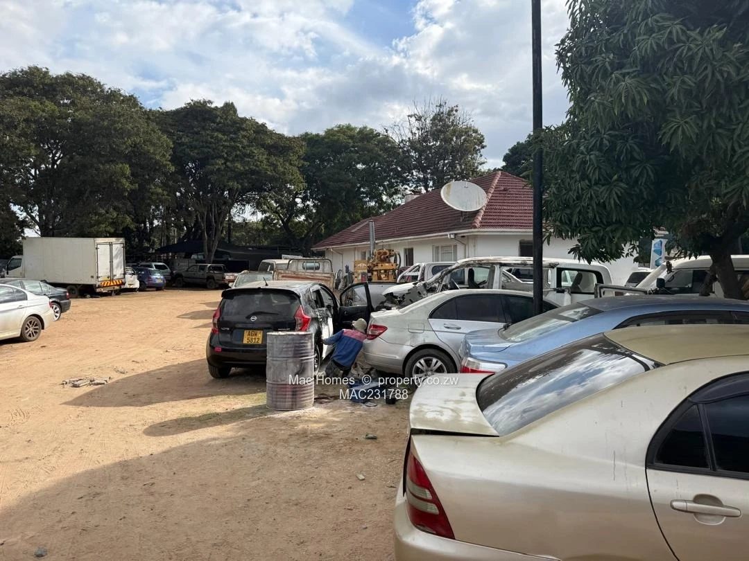 Prime commercial & industrial 12,000 m² land for sale in Hatfield, Harare South — rare main-road frontage with immediate visibility and high daytime traffic. The site already benefits from a solid single-storey commercial building with red tiled roof, paved forecourt and gated entrance (photos show an existing shop/office and a large herringbone-paved parking/turnaround area). Mature shade trees and a concrete boundary line the property, while the yard includes flexible hardstand and open dirt areas ideal for vehicle circulation, storage or light workshop activity.