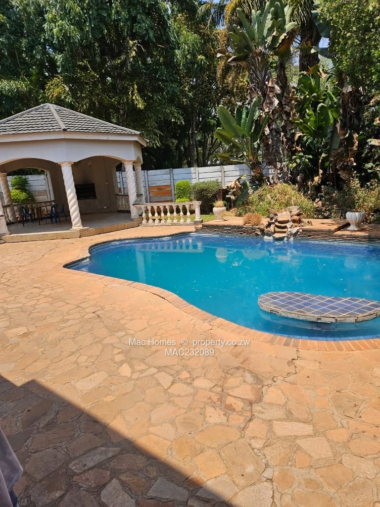 Proud to present this beautiful, spacious home located in Philadelphia, that is in Harare North. The home features 5 bedrooms, all ensuite, 3 bedrooms with built in wardrobes, 2 lounges, dining area with a fireplace and fitted kitchen. There is a double lock up garage, utility room,swimming pool, gazebo with a fireplace, 3 parking lots with sheds. Also there is a borehole, 5000L water tank, 2 fish ponds,a well maintained garden and a 2 bed cottage with open plan kitchen and lounge, and a combined bathroom and toilet.