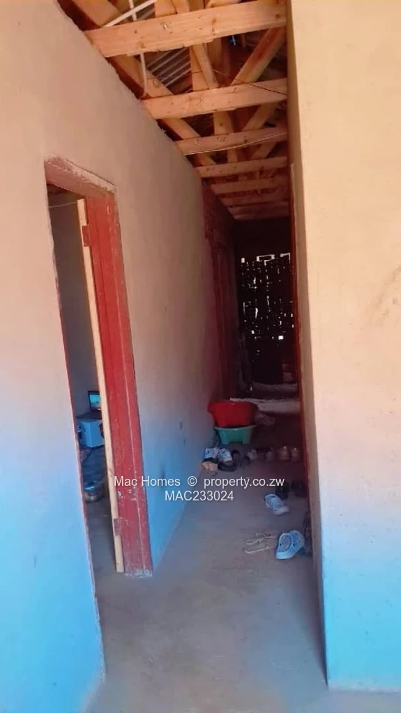 Solid investment opportunity in Kuwadzana — 3-bedroom, 1-bath house on a 280 m² stand with 150 m² of building space. The exterior photos show durable red-brick walls and a corrugated iron roof with fresh wooden trusses, plus a neat yard and satellite dish already fitted. Inside you’ll find spacious shell living areas with plastered walls ready for finishing (image shows open-plan room with new trusses), a long corridor leading to the bedrooms (see corridor shot) and a comfortable main bedroom with natural light and privacy (bedroom photo). Fitted window security bars and a solid wooden exterior door provide basic security. Property benefits include municipal water, a functioning sewer connection, reliable ZESA supply, and a garage for parking/storage. Ideal for a family wanting to complete finishes to taste or for an investor seeking a high-density rental asset in Harare. Priced to reflect the need for cosmetic work and fast to occupy once finished. Call now to view and explore renovation options.